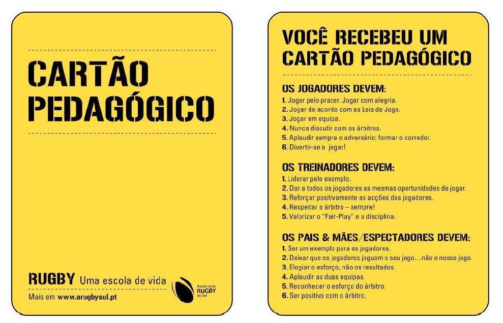 E, depois, há toda a mística do jogo! O cultivar da diferença para os outros desportos (especialmente os mais profissionalizados). Envio-lhe, em anexo, um “Cartão Pedagógico” (devia ter um com o logo da Associação de Rugby do Norte, mas não o encontro). Foi uma iniciativa que desenvolvemos no Pós-Mundial 2007 (quando houve um enorme crescimento da modalidade), e que eram oferecidos, pelas organizações dos torneios, a todos os elementos (Pais&Mães; Jogadores; Treinadores) que se estivessem a comportar fora do “espírito do rugby”. Porque, o cultivar essa diferença, é para nós muito importante.