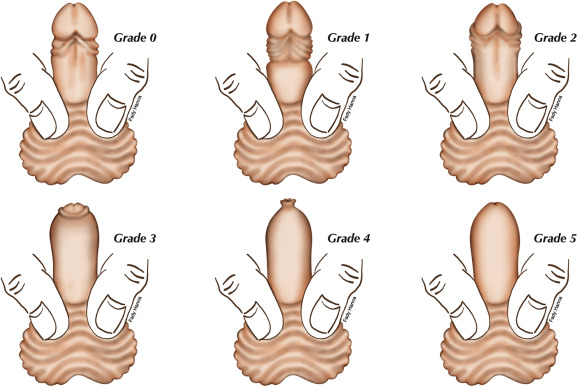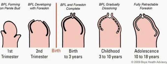 Como é que sabemos se o descolamento está completo? Noventa por cento dos meninos terão descolamento e retracção completa do prepúcio pelos 3 anos de idade. Por esta altura (ou quando o médico assitente indicar), durante ou logo após do banho, quando a pele está mais humedecida e laxa, os pais devem fazer uma retracção leve do prepúcio. Fazer até onde conseguirem sem nunca forçar. É frequente notar-se um aperto a toda a volta, o chamado anel prepucial. Forçar a passagem deste anel pode fazer sangrar esta pele, magoando o menino e levando a uma cicatriz (causa de fimose). Havia o hábito antigo (infelizmente não completamente abandonado) de forçar um descolamento na consulta. Na maioria das vezes, as criança deixava de confiar no médico que lhe tinha feito a maldade e nos pais que tinham sido coniventes, agarrando-o à marquesa, pelo que pura e simplesmente não deixava ninguém tocar ‘no seu instrumento’, durante longos meses. Logo, o prepúcio voltava a aderir e, muitas vezes, desenvolvia a tal cicatriz (fimose cicatricial). Se a retracção for feita progressiva e diaramente, haverá uma altura em que a pele virá completamente para trás.