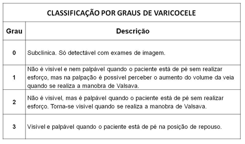 Mas vamos por partes. O que é o varicocelo? A analogia que a maioria dos pais percebe é a de que se trata duma variz que aparece nas veias dos testículos, pois o varicocelo apresenta-se como umas veias dilatadas na raíz do escroto. Tal como nas varizes das pernas, estas veias dilatadas devem-se ao ‘refluxo’ do sangue venoso para trás. Nos casos mais graves, as veias são tão dilatadas que parecem um cacho de uvas (ou saco de vermes, para uma tradução literal duma imagem usada pelos ingleses). Nos casos mais ligeiros, as veias dilatadas aparecem só após um esforço físico (como a contração abdominal ou manobra de Valsalva). Logo, temos vários graus de varicocelos, conforme a tabela abaixo, e nem todos são para operar.